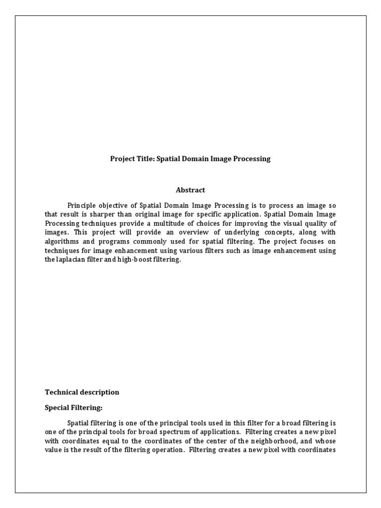 Matlab project Matlab Codes: Spatial Image enhancement techniques Special Filtering Principle objective of Spatial Domain Image Processing is to process an image so that result is sharper than original image for specific